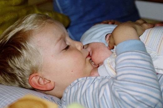 Als wir nach Hause kamen, ging es steil bergauf, Border hatte immer besser getrunken und nahm stetig zu. Wir führten noch genau Buch über sein Gedeihen. Und wir hatten unser liebe Hebamme, die uns betreute. Wir stellte Broder unserm Kinderarzt vor und langsam lebten wir uns alle ein. Wir mußten noch einige Male in dei UNi wegen den Retinakotrollen. Aber im Großen und Ganzen war es ruhig geworden. Wir konnten vieles nachholen. Unsere Krankengymnastin kam zu uns ins Haus. Der Alltag kam wieder und der Papa mußte nun auch wieder arbeiten.... Und Morten freute sich jeden Tag mehr über sein Brüderchen.